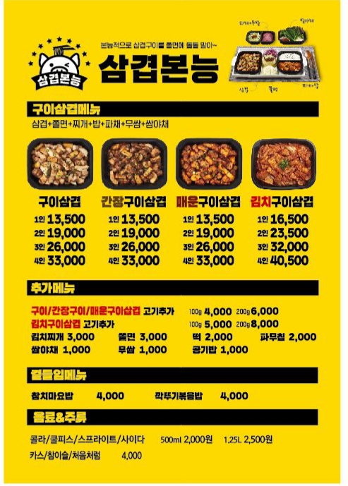 구이삼겹 2인 19,000 | 간장구인삼겹 2인 19,000 | 매운구이삼겹 2인 19,000
