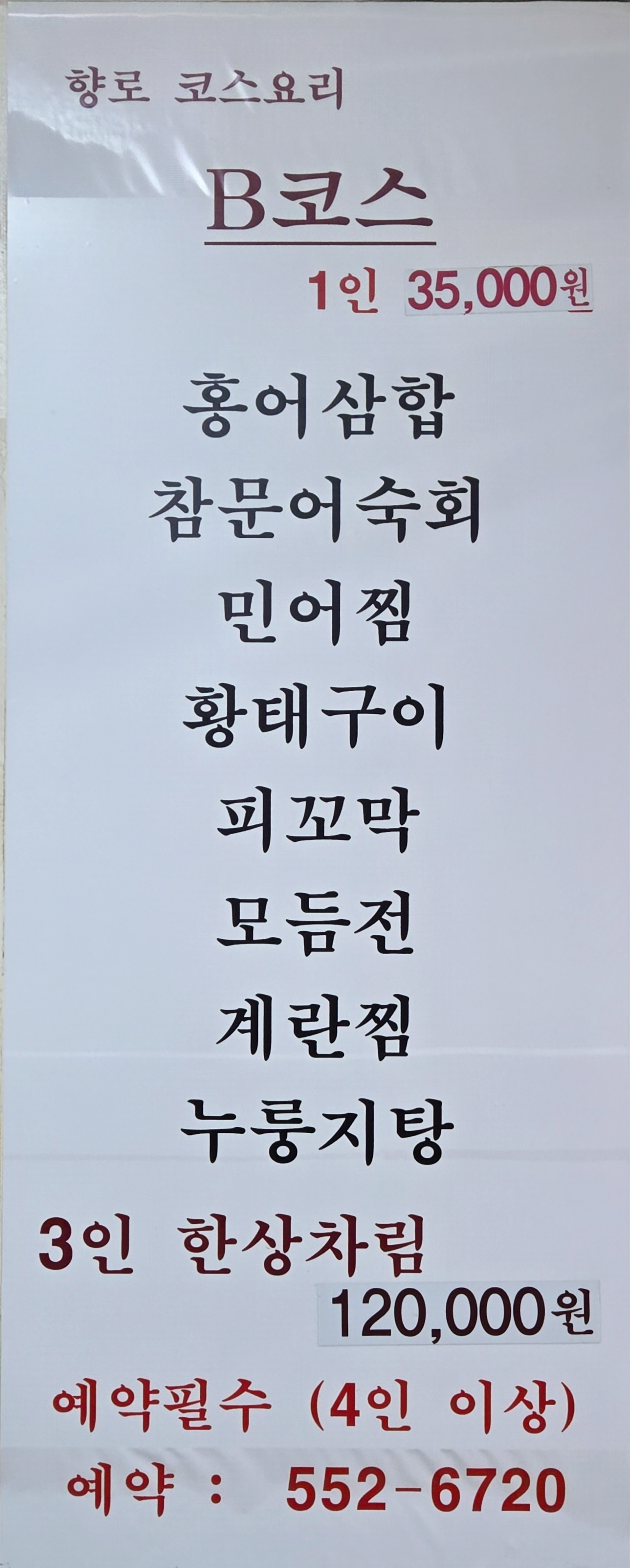 향로코스(1인) 35,000 | 3인 한상차림 120,000 | 맥주/소주 6,000 | 홍어삼합 45,000 | 삼겹수육 35,000 | 홍어회무침 30,000 | 모듬전 20,000 | 코다리찜 25,000 | 참문어숙회 45,000 | 민어찜 40,000 | 황태구이 15,000 | 생굴전 20,000