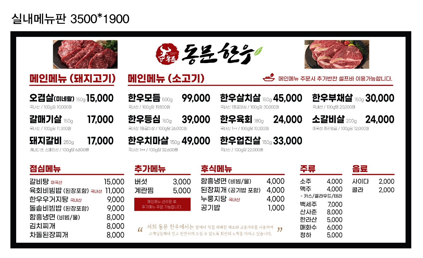 흑염소탕 12,000 | 한우채끝살 450g 94,000 | 한우스페셜 500g 85,000 | 한우꽃등심 500g 68,000 | 한우등심 500g 52,000 | 소 한마리 살치살 600g 74,000 | 소한마리스페셜 800g 74,000 | 소한마리 900g 69,000 | 황제소갈비살 900g 64,000 | 이베리코 흑돼지 모듬 600g 48,000 | 이베리코 삼겹살 510g 38,000 | 한우육회비빔밥 11,000 | 차돌된장찌개 8,000 | 한우 우거지 국밥 9,000 | 왕갈비탕 12,000 | 특왕갈비탕 15,000 | 도가니탕 13,000 | 수제돼지갈비 750g 38,000 | 안창살 39,000 | 한우육회 25,000 | 한우등심 52,000 | 소한마리+우거지탕 75,000 | 소한마리+우거지탕+육회 87,000 | 소한마리+우거지탕+육회+계란찜 90,000 | 황제갈비살 900g 64,000