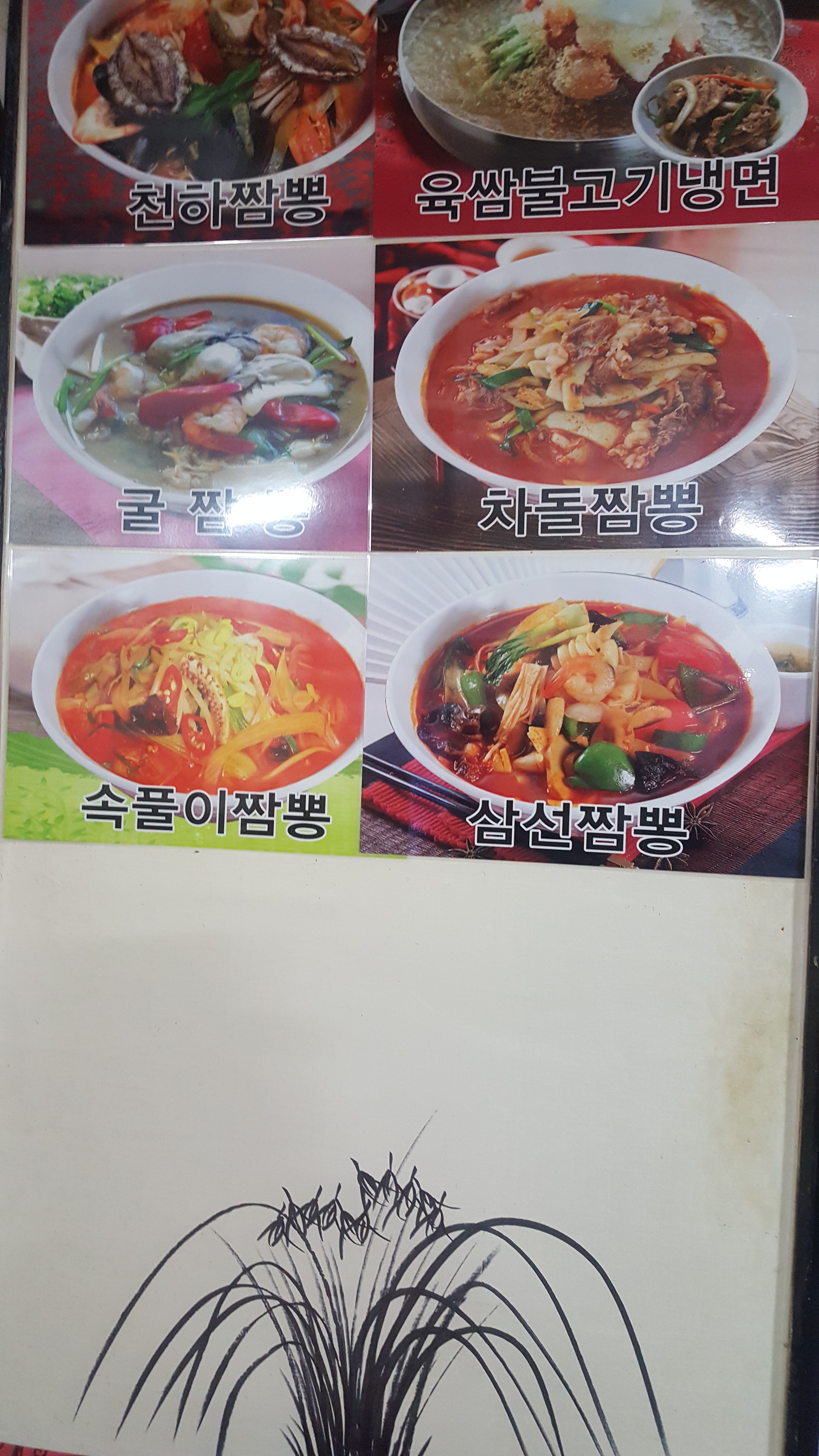 천하짬뽕 14,000 | 속풀이짬뽕 9,000 | 해물볶음짬뽕 9,000 | 차돌짬뽕 10,000 | 육삼불고기냉면 9,000 | 짜장 5,000 | 짬뽕 6,000 | 간짜장 6,000 | 우동 6,500 | 울면 6,500 | 해물쟁반짜장 7,500