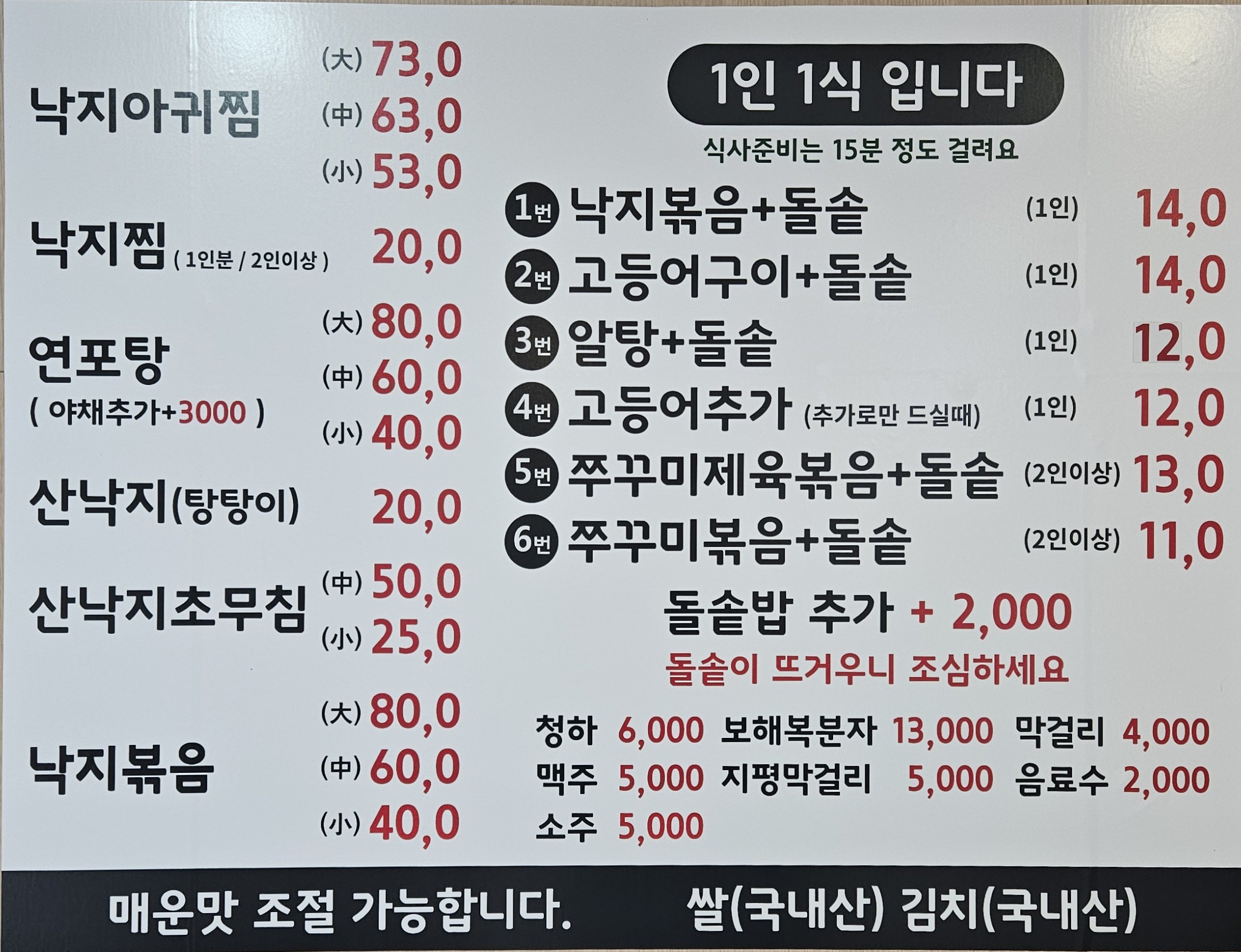 쭈꾸미 제육볶음 + 돌솥밥 13,000 | 쭈꾸미볶음 + 돌솥밥 11,000 | 낙지볶음+돌솥밥 14,000 | 고등어구이+돌솥밥 12,000 | 알탕+돌솥밥 11,000 | 낙지아귀찜(대) 73,000 | 낙지아귀찜(중) 63,000 | 낙지아귀찜(소) 53,000 | 연포탕(중) 60,000 | 연포탕(소) 40,000 | 산낙지 20,000 | 산낙지 초무침 소 25,000 | 낙지찜(2인이상) 20,000 | 낙지볶음 소 40,000 | 낙지볶음 중 60,000 | 연포탕 (대) 80,000 | 산낙지 초무침 중 50,000